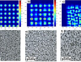 Changes in a pattern homogeneity from the ideal shape (a) to the defocused pattern for 10 µm (b) and 20 µm (c) and compares the calculation with experiment (d-f)