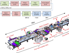 The HiLASE Centre 100 laser (‘Bivoj’) is based on a master oscillator power amplifier (MOPA) architecture incorporating multiple amplification stages, as shown schematically in Figure 1. A front end provides temporally (2 to 10 ns in duration) and spatially (21.5 mm square flat-top) shaped seed pulses with energies in excess of 100 mJ at 1029.5 nm. These pulses are then amplified to up to 10 J in a cryogenic pre-amplifier. The square output beam from the pre-amplifier is then expanded to a width of 75 mm before a final cryo-amplifier boosts the pulse energy to the 100 J-level. Both cryo-amplifiers are based on a multi-slab design, using Yb:YAG ceramic as their gain media, cooled by a high velocity stream of helium gas at cryogenic temperature, and employ a multi-pass architecture to extract the stored energy from the separate 940 nm pump diode sources. A 3D model of the complete HiLASE100 system is shown in Figure 1. Details of the individual cryo-amplifier designs, extraction architectures, and system components have been reported in several publications.