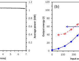 Figure 2(a) shows performance data from the first operating run over 5 minutes at 105 J, 10 Hz clearly showing the energy ramping process. This output energy was achieved at a pump energy of 465 J and operating temperature of 150 K, corresponding to an optical-to-optical conversion efficiency of 22.5%, as seen in Figure 2(b).