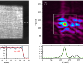 Figure 4(a) shows an output beam profile measured on a diagnostic camera at 102 J and 10 Hz along with a horizontal cross-section taken through the centre of the beam. The red curve is a 10th order super-Gaussian fit to the cross-section data. The circular shaped fringes are artefacts caused by diffraction within the diagnostic channel. An image of the focal spot of the beam captured at maximum output energy is shown in Figure 4(b). The FWHM angular spread of the central maximum was 19 μrad (x-axis) and 20 μrad (y-axis), corresponding to 1.5 and 1.6 times the diffraction limit for a square super-Gaussian beam, respectively. The shape of the deformable mirror was not changed from that determined during 1 Hz seed tests so optimisation may yield further improvement in beam quality.