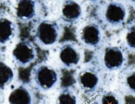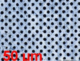 Success test of designed interference processing station suitable for interference micromachining with hundreds or thousands of laser beams at the same time, allowing to use the full protentional of powerful HiLASE Centre lasers. It works on a principle when original laser beam is divided into two or more laser beams, which are recombined at the sample surface forming an interference pattern which is then directly imprinted into the material. Tested interference pattern was composed of several thousands laser spots arranged in the rectangular grid with a spot diameter between 2 um and 5 um and hatch distance of 7 um. The whole interference area of 1 – 2 mm2 were processed at the same time with this micrometre resolution. Sample used was a polyether ether ketone reinforced with carbon fibers, which is commonly used in aircraft and aerospace industry.