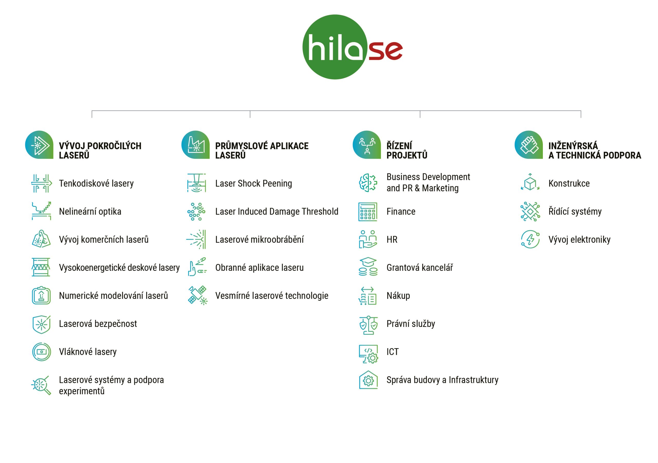Centrum HiLASE je organizačně rozděleno do 4 celků: dvou výzkumných a dvou podpůrných oddělení.